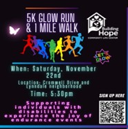 Light up the night at the GLO RUN 5k and 1 Mile walk Presented by Fleet Feet Greenville & Orthopaedics East! Join us for this fun after-dark event as we raise funds for Building Hope, a local organization that provides academic, social, and spiritual support for children and families in our community. Bring your lights and shine bright with us!